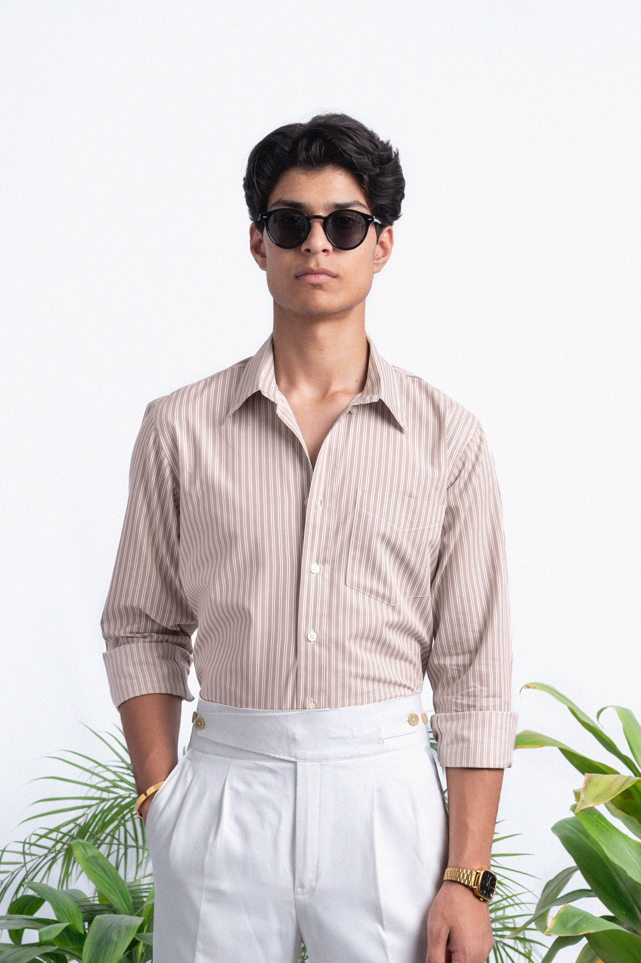 140s LUXURY BROWN WHITE POPLIN BUSINESS STRIPED SHIRT